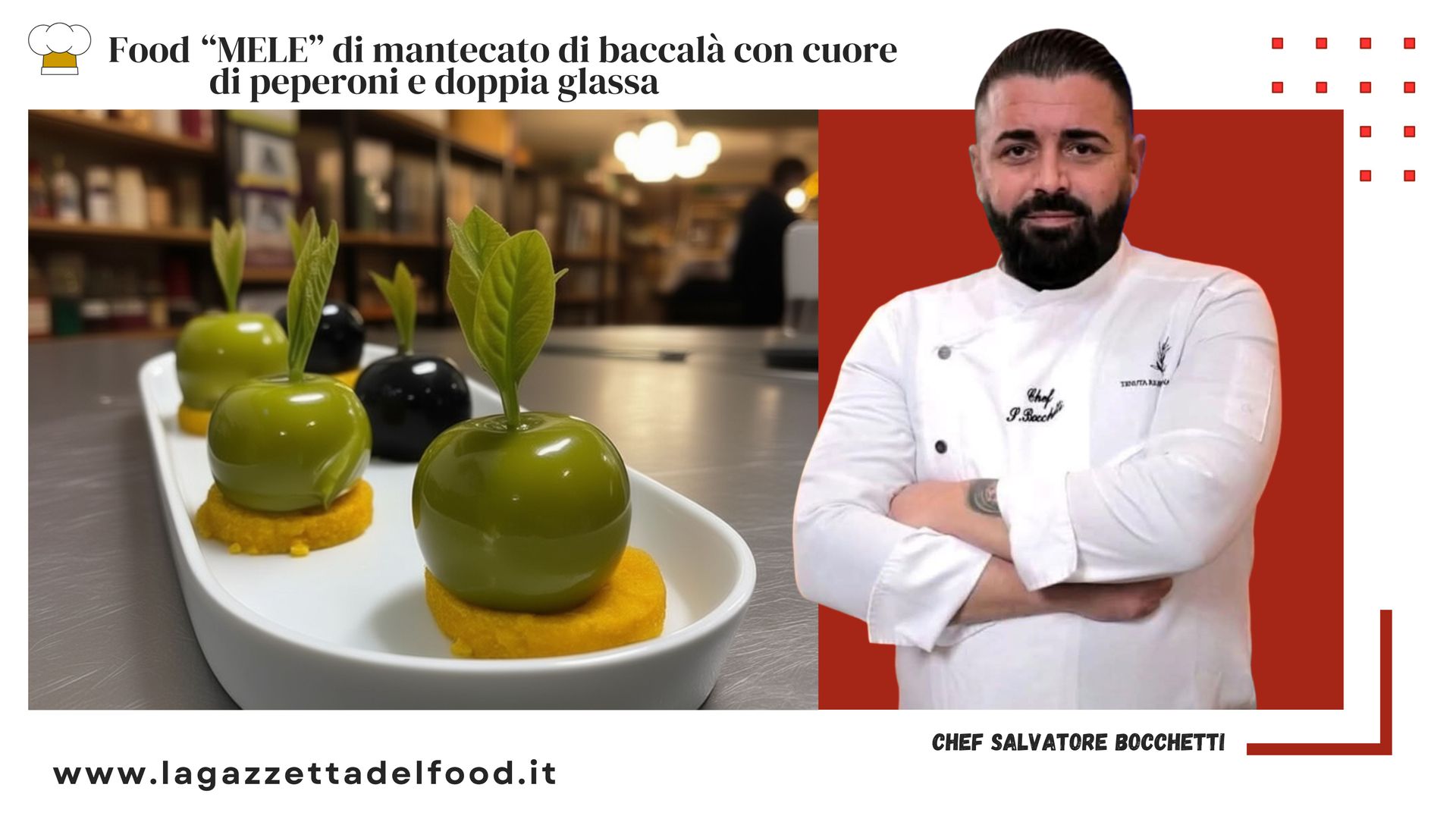 È da questa visione che prende forma una rilettura del baccalà mantecato, qui proposto in una veste inedita: una “mela” che coniuga rigore esecutivo, riconoscibilità visiva e stratificazione del gusto. Il piatto si inserisce nel filone della cucina identitaria evoluta, dove la memoria gastronomica viene reinterpretata attraverso tecniche moderne. Il baccalà, lavorato secondo una mantecatura classica, mantiene centralità e profondità aromatica, mentre l’inserto di peperoni introduce una componente vegetale che riequilibra la sapidità con una nota dolce e tostata. La doppia glassa, infine, non è mero esercizio estetico, ma contribuisce a definire struttura e percezione al palato. Ricetta (per circa 6 pezzi) Ingredienti 400 g baccalà dissalato 100 ml latte 120 ml olio extravergine di oliva 1 spicchio d’aglio 1 peperone rosso 1 peperone giallo 2 g nero di seppia 6 g gelatina Acqua q.b. Sale e pepe q.b. Procedimento Mantecato di baccalà Il baccalà viene cotto in una miscela di latte e acqua con uno spicchio d’aglio, mantenendo una temperatura dolce per preservarne la struttura. Una volta scolato, si lavora ancora caldo, condizione essenziale per ottenere un’emulsione stabile. L’olio extravergine viene incorporato a filo fino a raggiungere una consistenza liscia e vellutata. Si regola infine di sale e pepe. Inserto di peperoni I peperoni vengono arrostiti, pelati e frullati separatamente. Il passaggio successivo prevede una breve riduzione sul fuoco, utile a concentrare aromi e ottenere una texture più compatta. Il composto viene quindi colato in piccoli stampi e portato a congelamento. All’interno di stampi in silicone a forma di mela si dispone uno strato di mantecato di baccalà, si inserisce il cuore congelato di peperone e si completa con ulteriore crema. Il prodotto viene quindi abbattuto per stabilizzarne la struttura. Glassa Si realizza una base con acqua e gelatina, successivamente divisa in due parti. Nella prima si emulsiona olio extravergine per ottenere una glassa lucida e neutra; nella seconda si incorpora il nero di seppia, ottenendo una finitura più intensa e cromaticamente contrastata. Finitura Le preparazioni, ancora congelate, vengono sformate e glassate alternando le due componenti per ottenere un effetto visivo pulito e contemporaneo. Lo scongelamento avviene lentamente in frigorifero, così da preservare consistenze ed equilibrio gustativo. I n un momento storico in cui la cucina è chiamata a parlare linguaggi sempre più chiari e riconoscibili, questo piatto si impone come sintesi efficace tra tecnica e identità. Non è solo un esercizio di stile, ma una dichiarazione precisa: la tradizione può evolversi senza perdere autorevolezza, purché sostenuta da rigore e visione. La “mela” di baccalà mantecato diventa così un segno distintivo, un piccolo manifesto di cucina contemporanea dove l’impatto visivo apre la strada a un assaggio coerente, misurato, centrato. Un boccone che racconta un’idea precisa di ristorazione: essenziale, elegante, immediata, ma mai banale. E in un panorama gastronomico sempre più affollato, sono proprio piatti come questo a fare la differenza: capaci di farsi ricordare, prima con gli occhi, poi con la memoria del gusto.