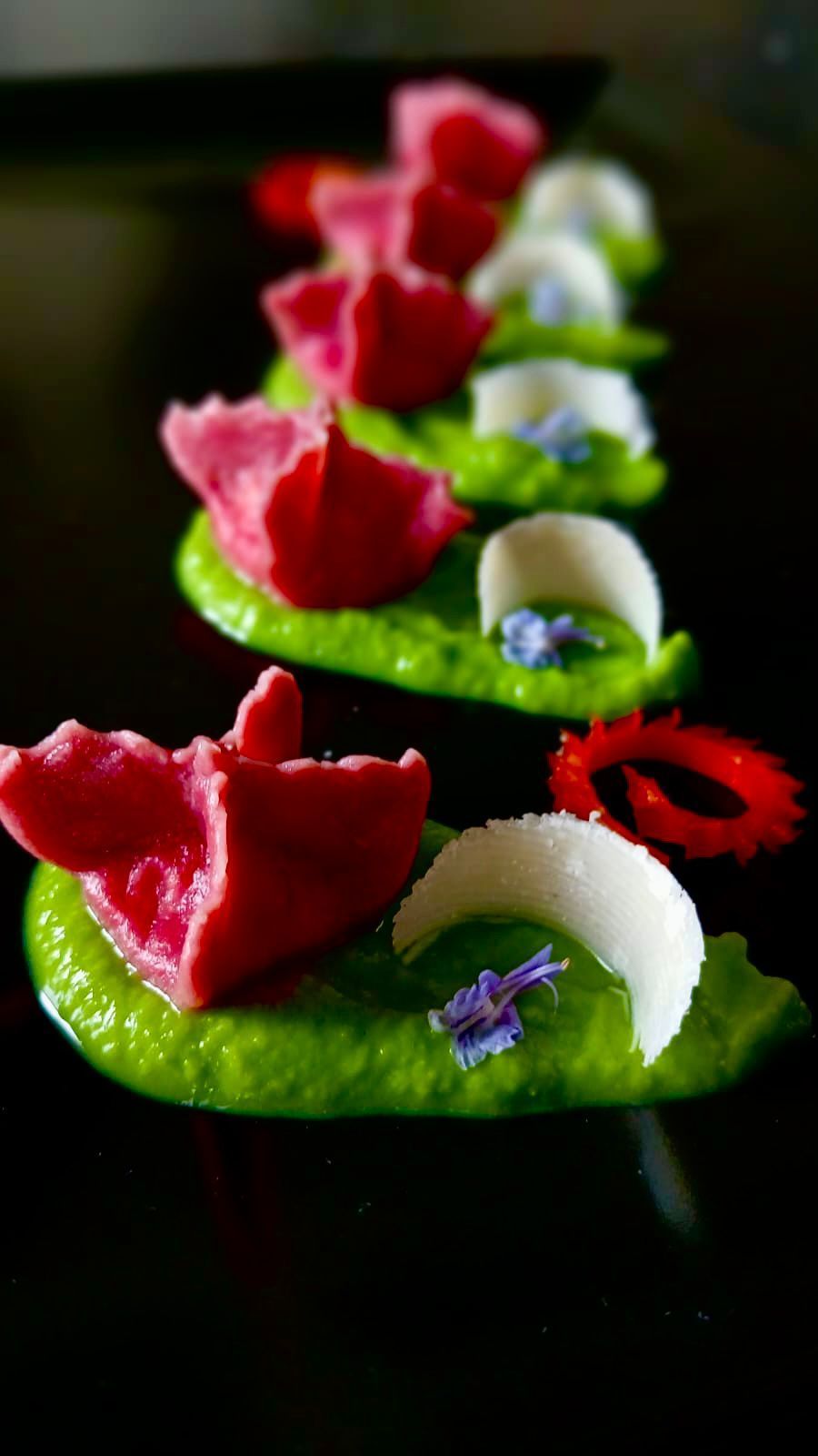 Colore, stagionalità e rispetto della materia prima: sono questi gli elementi che definiscono un piatto capace di raccontare una cucina essenziale ma profondamente contemporanea. I fagottini alla rapa rossa con gorgonzola, crema di asparagi selvatici e fiori di rosmarino nascono da un’idea semplice, quasi “povera”, ma trovano forza e identità in una scelta tecnica precisa e consapevole. Il colore intenso dell’impasto non è affidato a scorciatoie o polveri, ma esclusivamente alla rapa rossa, cotta lentamente nel forno a legna. Una lavorazione che concentra sapori e pigmenti naturali, valorizzata da un dettaglio tutt’altro che secondario: la selezione di rape rosse di piccole dimensioni. Più dolci, meno fibrose e cromaticamente più vive, sono la chiave per ottenere una sfoglia brillante e setosa, capace di stupire già al primo sguardo. Il ripieno di gorgonzola introduce una nota cremosa e decisa, bilanciata dalla delicatezza del burro fuso utilizzato come condimento. La base di crema di asparagi selvatici aggiunge profondità vegetale e richiama il territorio, mentre le scaglie di Parmigiano Reggiano completano il piatto con una sapidità elegante e persistente. A chiudere, un dettaglio floreale: i fiori di rosmarino, scelti non solo per l’aroma delicato ma anche per il loro tenue colore azzurro, che dialoga con le tonalità rosse e verdi del piatto, trasformando la composizione in un piccolo quadro gastronomico. Completamente vegetariano, questo piatto si presta perfettamente alla tavola della vigilia o a qualsiasi occasione in cui si desideri una proposta senza carne, ma ricca di carattere. È la dimostrazione che, con un tocco di fantasia e una profonda attenzione agli ingredienti, anche la cucina più semplice può evolvere in un’esperienza gastronomica raffinata. Buone feste e buon appetito.