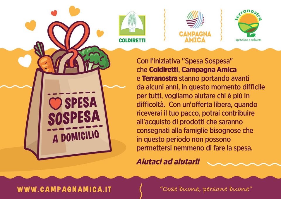 L’iniziativa “spesa sospesa” ha carattere nazionale, trae spunto dalla tradizione partenopea del caffè sospeso, con tutta la rete Coldiretti-Campagna Amica che dona direttamente prodotti e offre la possibilità di donare a tutti i cittadini: carne, salumi, ortofrutta e tante altri alimenti a filiera corta e di stagione.
